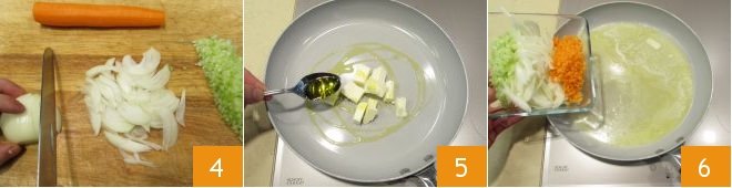Now take care of the basic sauté: wash and peel the carrot, onion, and celery, then finely chop them 4. In a large pan, melt the butter with the olive oil 5, then add the chopped vegetables 6