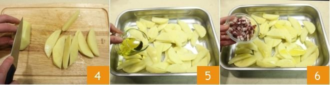First cut them in half lengthwise and then into wedges 4. Transfer the potato wedges into a baking dish that can comfortably hold them, season with a drizzle of olive oil 5, add the diced bacon 6,