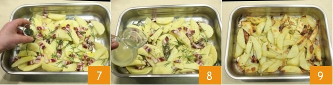 the rosemary and also the thyme 7, finally salt and pepper. Drizzle the potatoes with vegetable broth 8, stir them with a wooden spoon to flavor and then bake in a preheated static oven at 390°F for 55 minutes and then grill at 460°F (or the maximum temperature your oven allows) for another 5 minutes. Once cooked, your oven-baked potato wedges with bacon will be golden and crispy, take them out of the oven 9, let them cool slightly and enjoy them right away!