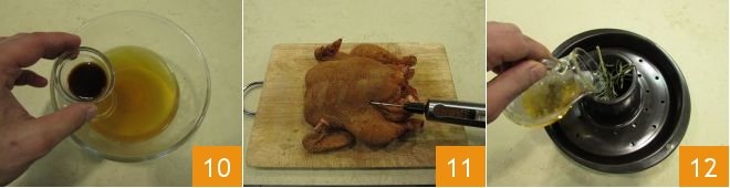 For the injections: take the previously prepared and cooled meat broth and add the Worcestershire sauce, draw the liquid with a meat syringe and inject it into the chicken's muscles 11, extracting the syringe as you insert the liquid. This movement allows better distribution of the liquids inside. During the injection, the tissues will swell, indicating a correct infiltration of the liquids. A large part will still be lost but the result will be very moist and juicy meat. Pour the beer into the central part of the special chicken cooking tray with the can, and add a sprig of rosemary 12.