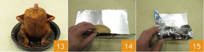 Place the chicken in the holder 13 and bake in a preheated static oven at 383°F for about 45/50 minutes. A quick side dish can be made with baked potatoes. Wash the potatoes well, and without removing the skin, wrap them in aluminum foil (14-15), then place them on a second tray to be placed on the lowest rack of the oven. Cook together with the chicken for the same time and at the same temperature.