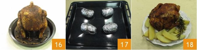 After about 50 minutes, remove the chicken 16 and the potatoes 17 from the oven. Serve your oven beer chicken still hot and accompany it with wedges of baked potatoes 18!