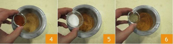 Add the chili pepper 4, salt 5, and pepper 6, continuing to grind. The mixture should be very fine.