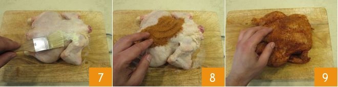 Dip a brush in the melted butter and lightly drizzle it over all parts of the chicken 7. Then begin to sprinkle the rub over the entire surface 8, both outside and inside the chicken, and massage well with your hands so that the aromas penetrate the fibers to flavor the meat 9. Wrap the chicken in plastic wrap and let it rest in the refrigerator for at least a couple of hours.