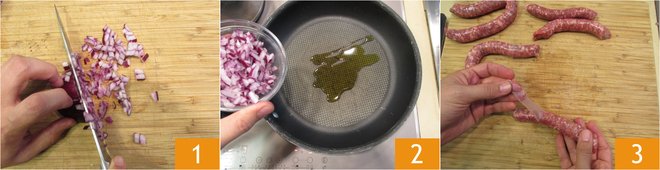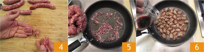 Cut the sausage into small pieces 4 and add it to the pan 5. When it is well browned, after about 10 minutes, deglaze with red wine and let it evaporate.