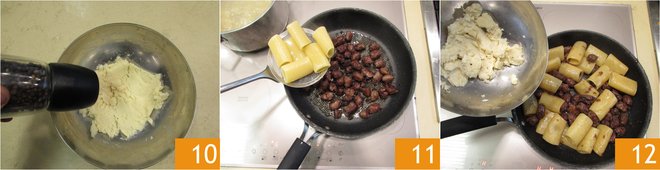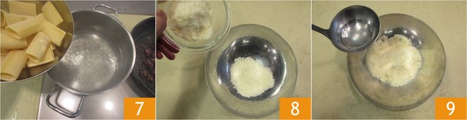 Boil the paccheri in plenty of salted boiling water 7, they should be drained al dente. The cooking time is about 16 minutes, but check the instructions on the package. Finely grate the cheeses into a bowl 8, add a small amount of cooking water 9.