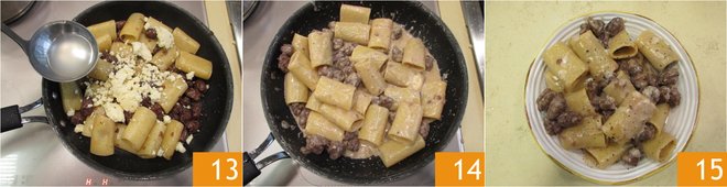 Don’t worry, just stir and toss the paccheri in the pan with a little cooking water at a time until it all melts and becomes a cheese and pepper cream 13 14. Be careful not to pour too much water which would curdle the mixture. Serve the cheese and pepper paccheri with sausage piping hot 15.