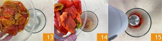 Transfer both the tomatoes 13 and peppers into a container 14 and blend with an immersion blender until you obtain a smooth and homogeneous sauce 15. Set aside.