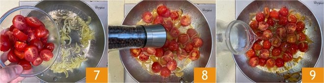 Add the cherry tomatoes 7 and season with salt and pepper 8, then pour in the water 9.