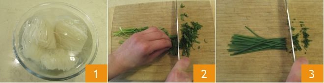 To prepare pad thai, first cover the rice noodles with warm water and let them soak until it's time to add them to the cooking 1. Wash and dry the cilantro, then chop it finely 2. Also chop the chives 3.