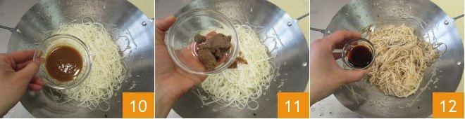 Add the tamarind juice 10 and fish paste 11, mix well, then also add half of the soy sauce 12 and mix again.