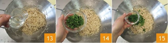 At this point, pour in the water 13 and increase the heat, then add the chopped cilantro 14 and chives 15, continuing to stir.