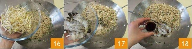 Also add the bean sprouts, which you have previously rinsed 16, and mix to combine them with the rest of the preparation, stir-frying everything over high heat. Now move the rice noodles to one side of the wok to create a free space and add the shrimp 17; pour the remaining soy sauce only over the shrimp 18
