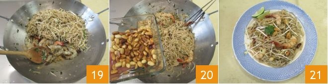 and briefly sear them, stirring gently to keep them intact 19. After searing the shrimp, mix to combine them with the rest of the preparation, add the toasted peanuts 20, and stir-fry everything one last time, then turn off the heat. Serve the pad thai garnishing the plate with some lime slices and enjoy it immediately 21!