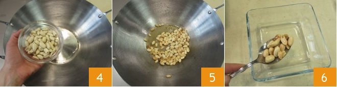 Heat the wok with 2 tablespoons of vegetable oil, then add the peanuts 4 and toast them for a few minutes, stirring often to prevent burning 5, then transfer them to a bowl 6 and set aside.