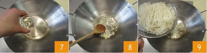 Remove the used oil from the wok and pour the remaining 2 tablespoons of vegetable oil 7, then grate the garlic cloves and sauté them over medium heat for a couple of minutes 8. Now drain the rice noodles and add them to the wok 9, mix to combine them with the sauté and stir-fry them over medium heat.