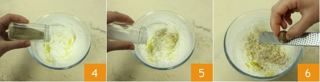 a bit of pepper 4, a pinch of salt 5, and grated nutmeg 6. Mix well and set aside.