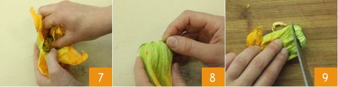 Clean the zucchini flowers by removing the inner pistil 7, the outer leaves 8, and cut off the base 9, keeping only the flower. You can use it whole or