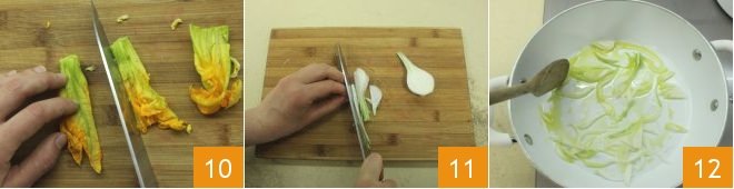 cut it into strips 10. Proceed to the spring onion: cut off the lower beard and the tougher green part, and chop the tender part 11. In a pan, sauté the spring onion with a drizzle of extra virgin olive oil until it becomes soft and transparent 12.