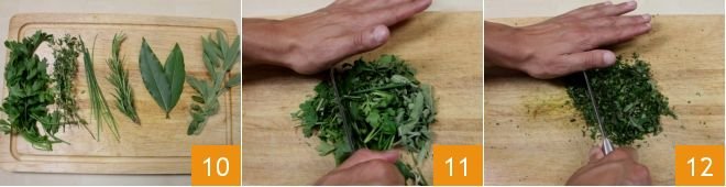 Now proceed to prepare the spices that will be used to season the potatoes. Take the sage, parsley, thyme, rosemary, bay leaf, and chives 10 and finely chop them with a knife or a mezzaluna (11-12).