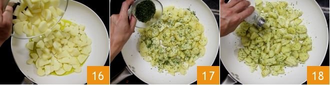 In a large pan, pour in oil to cover the bottom and heat it for a few moments. Then add the cut potatoes 16 and cook over medium heat for about 20-25 minutes, stirring often until they are well browned on all sides. Then add the previously chopped mix of aromatic herbs 17, stir and let it flavor for 1-2 minutes. Turn off the heat and season with salt to taste 18.