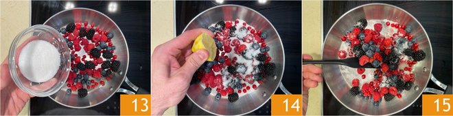 Add the sugar 13, the lemon juice 14, and cook over medium heat for 5-7 minutes 15.