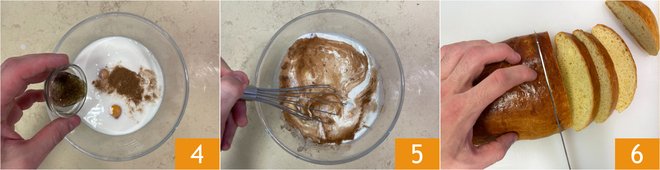 Also add the vanilla extract 4 and mix with a whisk 5 to combine the ingredients. Cut the brioche bread into fairly thick slices, about 1-1.2 inches 6. You should get 10 slices.