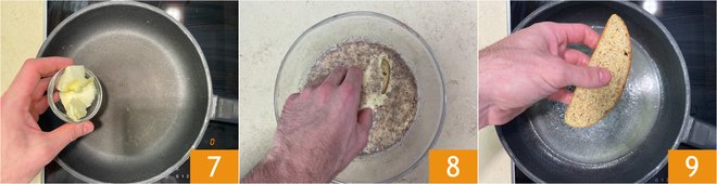 In a non-stick pan, melt the butter 7, then dip the slices of brioche bread into the milk and egg mixture 8 and transfer them to the hot pan 9.