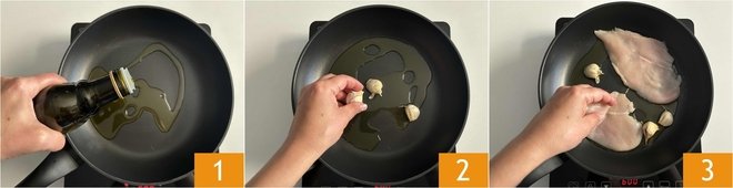 Preparing the pan-fried chicken breast is very quick. First, heat a non-stick pan over the stove with a drizzle of extra virgin olive oil 1 and 2 or 3 whole garlic cloves in their skins, but crushed, so they flavor without leaving a strong taste 2. Then lay down the chicken breasts when the oil is hot 3.