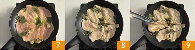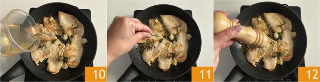 When the chicken breast is golden on both sides, deglaze with white wine 10 and let the alcohol evaporate, then lower the heat. Adjust with salt 11 and pepper 12.