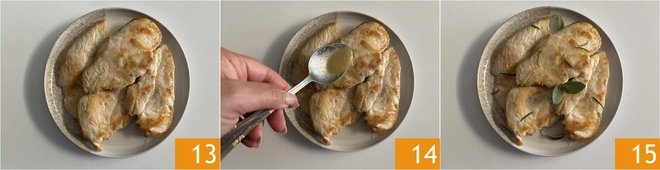 Once cooked, transfer it to a serving plate 13, drizzling it with the cooking sauce 14 and adding some sage leaves and a bit of rosemary 15. Now all that's left is to serve it!