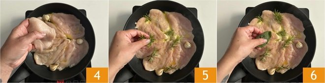 After adding all the breasts 4, add a few sprigs of rosemary 5 and some sage leaves 6.