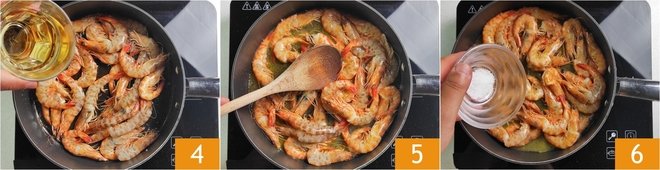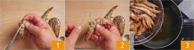 To make the pan-fried shrimp, first remove the intestine of the crustaceans by cutting the shell along the back 1 and gently extracting it with the help of a toothpick 2. There's no need to remove the shell, head, and legs. Heat the oil in a pan and sauté the shrimp for 2-3 minutes 3.