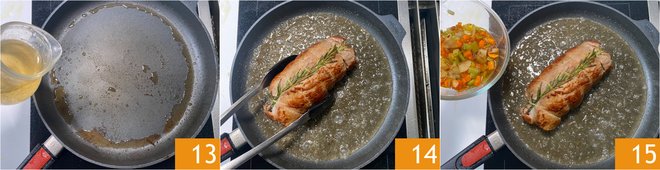 Pour the white wine into the pan 13 and deglaze the bottom. At this point, put the roast back in the pan 14 and add the vegetables 15.