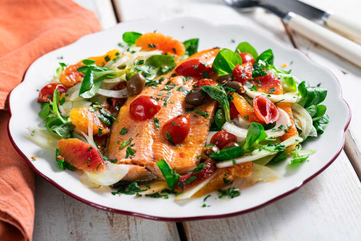 Place a trout fillet on top with its cherry tomato and olive sauce 16, then add the fennel and orange salad to the side 17. Finally, garnish with chopped parsley. Your pan-seared salmon trout is ready to be served 18!