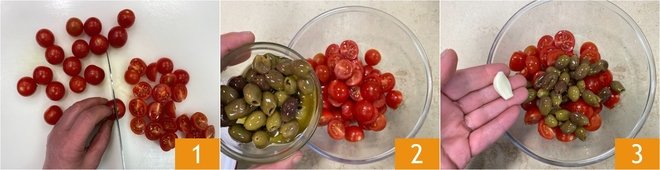 To prepare the pan-seared salmon trout, start with the cherry tomatoes: cut them in half 1 and place them in a bowl along with Taggiasca olives 2. Season with salt, oil, and a garlic clove 3, mix and set aside for the moment.
