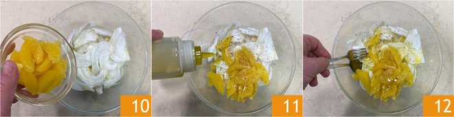 Combine the fennel and oranges in a bowl 10, then season with salt, pepper, and oil 11. Mix gently 12.