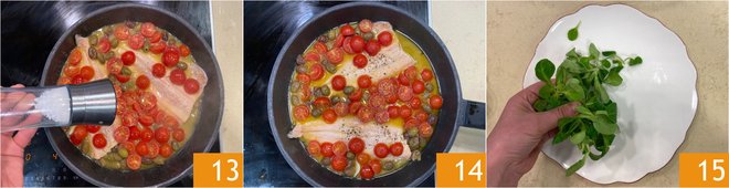 At this point, the trout will be cooked, so adjust the seasoning with salt 13 and pepper. Turn off the heat and let it rest for a minute before plating 14. Distribute the lamb's lettuce at the base of the plate 15.