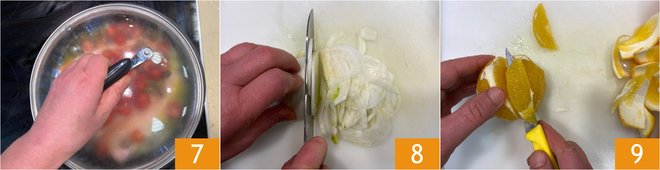 Cover with a lid 7 and continue cooking for another 5-7 minutes without turning the fillets. Meanwhile, prepare the fennel and orange salad: thinly slice the fennel 8, then peel the oranges and section them by cutting between the pulp and the white membrane with a sharp knife 9.