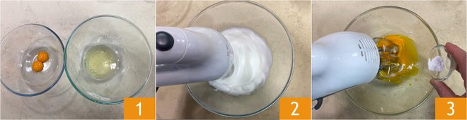 To prepare yeast-free pancakes, first melt the butter and let it cool slightly. Separate the yolks from the whites 1. Add a pinch of salt to the egg whites, then whip them with an electric mixer 2 and set aside. In the yolk bowl, add a pinch of baking soda 3 and start mixing.