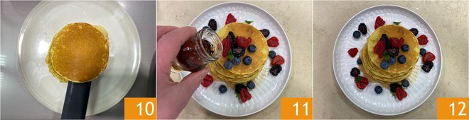 As the pancakes are cooked, stack them on a serving plate 10. Garnish with raspberries, blueberries, blackberries, and some fresh mint leaves, then drizzle with maple syrup 11. Your yeast-free pancakes are ready to be enjoyed 12!