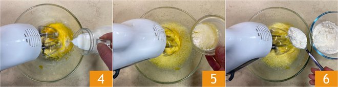 While the mixer is running, pour in the milk 4, the cooled melted butter 5, and the previously sifted flour 6.