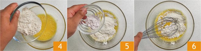 Add the sifted flour 4 and baking powder 5, then mix again 6.