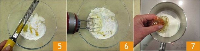 add the honey, grated zest of half a lemon and half an orange 5, and also add 200 ml (about 3/4 cup) of fresh liquid cream. Mix the ingredients with an electric mixer 6 until you obtain a smooth cream. Heat the remaining 20 ml (about 1 tbsp) of fresh liquid cream and the drained and gently wrung gelatin in a saucepan 7: dissolve the gelatin very well.