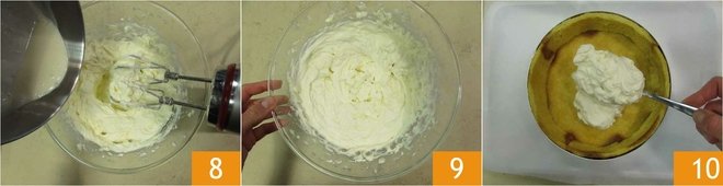 Pour everything onto the mascarpone cream 8 and mix for a few seconds with the electric mixer. Once ready 9, pour the mascarpone and cream mixture into the mold 10
