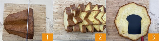 To prepare Pandoro French Toast with Nutella®, cut out a cardboard template in the shape of a brioche bread slice. Then cut the pandoro into slices about 3/4 inch thick 1 2. Cut out the shapes with the help of a small knife, placing the cardboard on each pandoro slice 3. From the first 3 slices, you will obtain two shapes and one from the smaller subsequent ones.