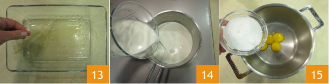 In the meantime, work on the cream. Soak the gelatin in cold water, it should absorb it completely 13, and while it softens pour cream and milk into a saucepan 14 and bring to a boil. In another saucepan, pour the egg yolks with the sugar 15,
