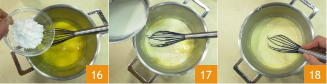 start mixing and then add the cornstarch 16. Pour in the hot cream and milk in a stream 17 to get a smooth mixture 18.