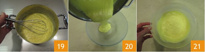 Move the pot to the stove. Cook, stirring continuously with a whisk until you have a smooth cream 19. Then transfer it to a bowl that you have chilled in the freezer 20 and stir for a few moments to lower the temperature of the cream 21.