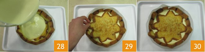 Pour the cream into the pandoro shell 28, place the last toasted pandoro slice inside (if needed, cut the tips with a shape slightly smaller than the mold) 29, place it on the cream gently pressing to compact. Let it set in the refrigerator for at least 4 hours 30.
